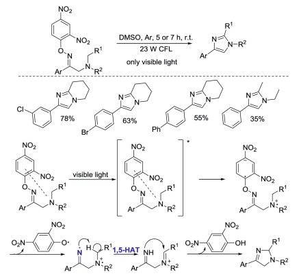 Fu group found that intramolecular C(sp3)−H imination of O-aryl oximes derivatives can be conducted in the presence of visible light as a sole requirement [42]. The reaction can be conducted well at room temperature and the obtained products imidazole derivatives with various functional groups were obtained smoothly. It is interesting to note that no catalyst, oxidant, additive, acid, and base were required for this transformation (Scheme 14). Investigation of the reaction mechanism revealed that the formation of iminyl radical and 1, 5-HAT were involved in the reaction process. The products containing pyrrolidinyl were more stable than those containing six-membered cycles and acyclic tertiary amines, since oxidation products were not formed when substituted 1-phenyl-2(pyrrolidin-1-yl)ethanone O-(2, 4-dinitrophenyl)oximes was subjected to this reaction (Scheme 15).