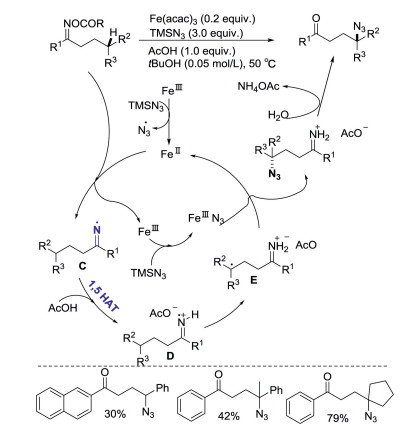 In 2019, iron−catalysed remote C(sp3)-H azidation of O-Acyl oximes for the synthesis of γ-azido ketones was realized by Zhu group (Scheme 16) [43]. A wide range of γ-azido ketones with good to excellent yields were obtained. TMSN3 served not only as a nitrogen source to functionalize the unactivated C(sp3)-H, but also as a reductant to generate the catalytically active FeⅡ in situ. Acid (HOAc) palyed an important role in both 1, 5-HAT process and the hydrolysis of imines to ketones, which could accelerate the reaction via speeding up the 1, 5-HAT process. Control experiments supported the involvement of C-centred radical in this azidation reaction. A sequence of reductive generation of an iminyl radical by FeⅡ, 1, 5-hydrogen atom transfer (1, 5-HAT) and iron-mediated redox azido transfer to the translocated carbon radical were proposed for the reaction mechanism. Additionally, nacyloxy imidates were also good substrates for this reaction, providing various β-azido alcohols.