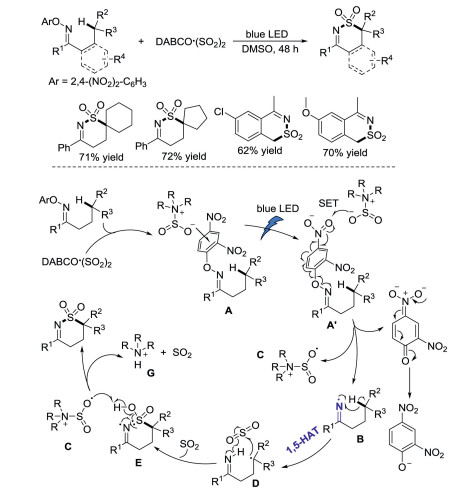 1, 4-Diazabicyclo[2.2.2]octane-1, 4-diium-1, 4-disulfinate (DABSO) as a substitute for sulfur dioxide has gained much achievement in construction of sulfonyl compounds [44-47]. In 2017, N−radical initiated aminosulfonylation of C(sp3)−H bond through insertion of sulfur dioxide mediated by visible light was reported by Wu group (Scheme 17) [48]. In the absence of metals or photoredox catalysts, the reaction of O-aryl oximes with DABSO proceeded smoothly at room temperature under blue LED irradiation. Substrates containing a six-membered, five-membered carbocycle or benzylic carbon all react well in this system. In the reaction mechanism, iminyl radical was generated form the reaction of O-aryl oximes with DABSO under visible-light irradiation. Then 1, 5-hydrogen atom transfer, insertion of sulfur dioxide occurred in sequence to give 1, 2-thiazine 1, 1-dioxide derivatives.