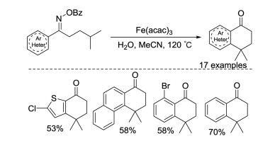 In 2019, Wu group found that iron [21] was also good catalyst for the synthesis of dihydronaphthalenones from aromatic oxime esters via 1, 5-hydrogen atom transfer (Scheme 3). The corresponding products dihydronaphthalenones with moderate to good yields and high chemoselectivities were achieved. However, oxime esters with secondary γ-C(sp3)-H and primary γ-C(sp3)-H bond were not effective for this strategy. The result of control experiment implied that radical intermediate was involved in this reaction. Reductive generation of iminyl radical from oxime ester by iron(n), 1, 5-hydrogen atom transfer and intramolecular radical cyclization were proposed in the reaction mechanism to deliver the desired products.