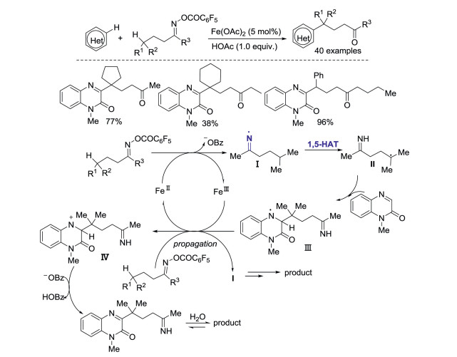 The iron-catalyzed reaction of oximes and heteroaryls for the synthesis of alkyl ketones was reported by Guo group (Scheme 4) [22]. Various alkyl ketones and heteroaryls were suitable for this transformation. HOAc was needed for this reaction, it might increase the electrophilic nature of heteroarenes to enable easier trapping by the nucleophilic alkyl radical. Oxime esters with secondary or tertiary C−H were well compatible with this reaction. Unfortunately, oxime esters with primary C−H bonds, even benzylic C−H bonds did not deliver the desired products. A radical pathway was possible for this reaction. Formation of iminyl radical via single−electron reduction of oxime ester by FeⅡ, carbon radical formation trigged by 1, 5−HAT, radical addition, oxidization of carbon radical, deprotonation and hydrolysis were proposed for the mechanism. Notably, a radical chain propagation mechanism cannot be ruled out completely.