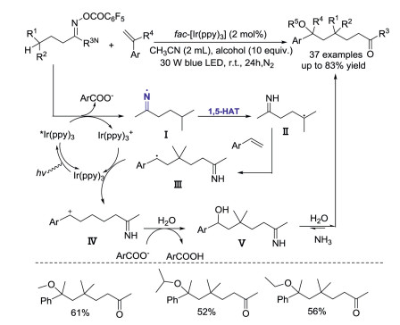 In 2018, Duan group realized [25] the visible light mediated three-component γ-hydroxyalkylation of ketones under redox neutral conditions (Scheme 7). Water and simple alcohols were effective nucleophiles, providng the desired γ-carboetherification of ketones in good yields. But the sterically hindered alcohols, amines or indoles were not suitable for this system. Radical trapping experiments implied that C-centered radical generated through 1, 5-HAT should be involved in this transformation. In the mechanism, tandem iminyl radical−triggered 1, 5-HAT followed by oxyalkylation of unactivated alkenes were proposed to give the controlled γ-C(sp3)-H bonds functionalization of ketones. Oxime esters with secondary or tertiary γ-C(sp3)-H bonds all reacted smoothly. However, oxime ester having primary C−H bond did not gave the desired product.