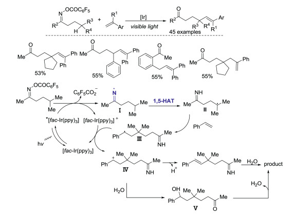 Duan group found [27] that γ−vinylated ketones could also be synthesized via the reaction of oximes with alkenes (Scheme 9). A wide range of available alkenes were well applied to this reaction and forming the desired products γ-alkenyl ketones with moderate to high yields. This protocol could also be used to modify the complex molecules such as estronederived olefins. Unfortunately, the primary C(sp3)-H bonds were not compatible in this reaction. The substrate with benzylic C(sp3)-H bonds could produce the expected products, albeit in somewhat low yields. Mechanism examination implied that carbon center radical was involved in this transformation. Firstly, formation of iminyl radical formed from single-electron reduction of oximes by excited species IrⅢ*. Then, 1, 5-HAT induced by iminyl radical take place to give the C−centered radical, which followed by radical addition with alkenes, oxidation by IrⅣ to carbocation intermediate, deprotonation and hydrolysis to provide the final product. Alternatively, capture of the carbocation by water to form alcohol, which followed by dehydration to afford the desired product was also possible.