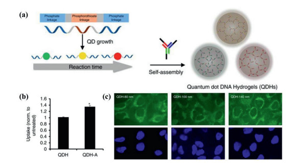 | Fig. 10. (a) Schematic representations of preparation process of the self-assembled QDs DNA hydrogels (QDHs); (b) Confocal microscopy images of Hela cells incubated with 80 nm, 100 nm, and 140 nm QDH (green), nuclei (blue); (c) Uptake of QDH and QDH-aptamer via flow cytometry. Copied with permission [37]. Copyright 2017, The Author(s). | |