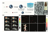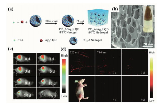 | Fig. 11. (a) Pictorial illustration of the fabrication of the PC10A/Ag2S QDs/PTX hydrogels; (b) SEM image and photo (inset) of the PC10A/Ag2S QDs/PTX hydrogels; (c) Fluorescence imaging of mice that injected with 100 μL of the PC10A/Ag2S QDs/PTX hydrogel; (d) PA imaging of the tumor site that injected with 100 uL of the PC10A/Ag2S QDs/PTX hydrogel (λex= 744 and 523 nm). Copied with permission [73]. Copyright 2019, Royal Society of Chemistry. | |