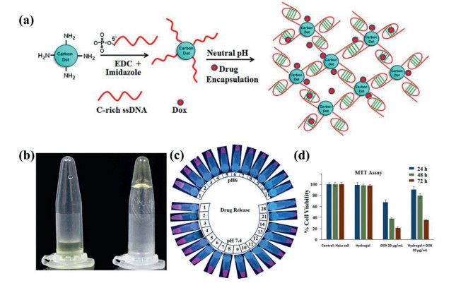 Singh et al. [77] utilized the low extracellular pH in the tumor microenvironment to develop a DNA-CDs hybrid hydrogel. CDs and chemotherapeutic drug Doxorubicin (DOX) were encapsulated in the hydrogels, which acted as a container for sustained release for the drug (Fig. 12a). In addition to acting as a cross-linker for network formation, CDs also helped encapsulate drugs with DNA through electrostatic action. When the pH of the solution altered from alkaline to acidic, the DNA-CDs hybrid hydrogel underwent a sol-gel transition (Fig. 12b). The presence of CDs made it possible to track the hydrogel dissolution and drug loading (Fig. 12c). When cell viability tests were carried out in Hela cells, the hybrid hydrogels could effectively kill Hela cells in presence of the Dox-loaded hydrogels due to the damaging effect of acidic pH on hydrogels (Fig. 12d).