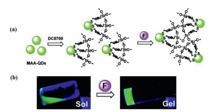 | Fig. 3. (a) Schematic diagram of gelation with the introduction of fluoride into the DC5700-QDs System; (b) Sol-gel phase transition of DC5700-QDs solutions with fluoride sodium (λex = 365 nm). Copied with permission [45]. Copyright 2018, American Chemical Society. | |