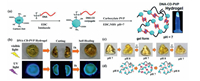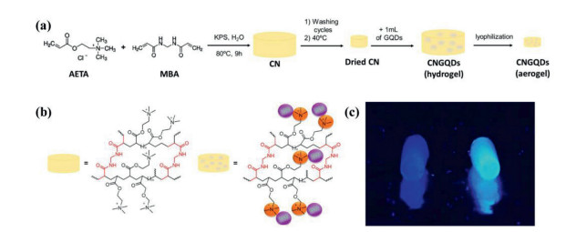 | Fig. 4. (a) Preparation process of GQDs-hydrogel (CNGQDs); (b) Chemical structure of the chemically cross-linked hydrogel (CN) and CNGQDs; (c) Photo of CN (left) and CNGQDs (right) (λex = 365 nm). Reproduced with permission [47]. Copyright 2018, American Chemical Society. | |