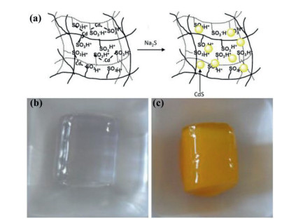 | Fig. 5. (a) A schematic diagram of the in-situ formation of CdS QDs in a p(AMPS) hydrogel; (b) Photo of bare p(AMPS); (c) Photo of p(AMPS)-CdS QDs. Reproduced with permission [49]. Copyright 2011, Elsevier. B.V. | |