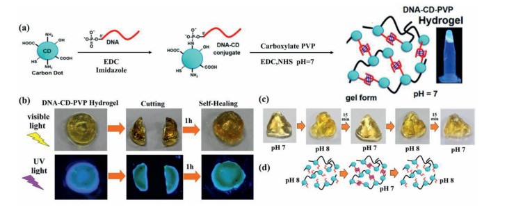 | Fig. 6. (a) A pictorial representation for the synthesis of DNA-CD-PVP hydrogels from CDs, DNA, carboxylate PVP; (b) Images presenting the self-healing process; (c) Images presenting the shape memory; (d) A pictorial diagram for the retention of shape of the hydrogel at pH 7. Reproduced with permission [51]. Copyright 2019, American Chemical Society. | |