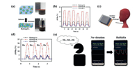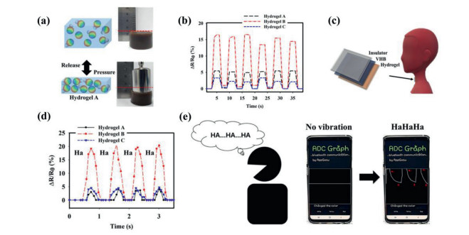 | Fig. 7. (a) Pressure-sensing schematic diagrams and photos of prepared hydrogels under a pressing weight of 10 N; (b) Reponses of hydrogel A, B, C in case of repetitive pressure loading/unloading; (c) PVA/C-Chitosan/f-CD hydrogels used for sensing the vocal cord vibration; (d) Resistance response of the prepared PVA/C-Chitosan/f-CD hydrogels when speaking "Ha"; (e) Biosensing process of the speaking of "Ha" using hydrogel B during connection to smartphone. Copied with permission [55]. Copyright 2020, American Chemical Society. | |