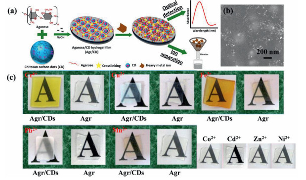 | Fig. 8. (a) Schematic presentation upon preparation of agarose/CDs (Agr/CDs) hydrogel film and its application for optical detection and ion separation; (b) SEM image of Agr/CDs; (c) Photos of the color variation of Agr/CDs and Agr when immersed in the heavy metal ion solution (Cr6+, Cu2+, Fe3+, Pb2+ and Mn2+). Reproduced with permission [56]. Copyright 2015, American Chemical Society. | |