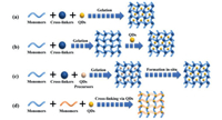| Fig. 2. Four main approaches employed to acquire QDs-hydrogel composites: (a) Hydrogel gelation in a QDs solution; (b) Physically embedding prepared QDs into hydrogels after gelation; (c) Forming QDs in situ within the preformed gel; (d) Cross-linking via QDs to form hydrogels. | |