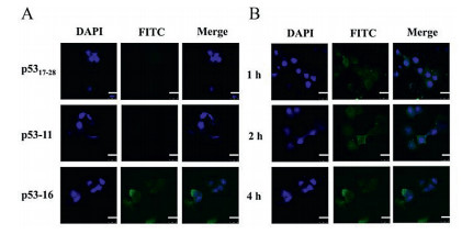 | Fig. 5. (A) CLSM of FITC-labeled p5317–28 analogs (20 μmol/L) localization in MCF-7 cells in vitro for 4 h. The nuclei were stained with DAPI (blue). (B) CLSM images of FITC-labeled p53-16 (20 μmol/L) localization in MCF-7 cells in vitro for 1, 2 and 4 h, respectively. The scale bar is 25 μm. | |