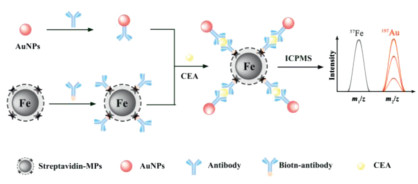 Inspired by the above, we designed a novel ratiometric immunoassay utilizing intrinsic Fe isotope in commercialized MPs as an IS. The Fe isotope in MPs and Au isotope in bioprobes were sensitively and simultaneously detected by inductively coupled plasma mass spectrometry (ICPMS), which is regarded as one of the most potent commercialized tool for the quantification of metal elements and metal isotopes [35, 36]. Carcinoembryonic antigen (CEA), a broad-spectrum biomarker for diseases including colorectal, lung, pancreatic, gastric, breast, ovarian cancers, was chosen as a model analyte [37, 38]. The MPs were served as not only support and separator for immunoassay but also IS. The accuracy and reliability of the proposed MPs-based immunoassay were greatly enhanced by circumventing the challenge of MPs loss during magnetic separation and absolute intensity-related signal reading, which can bring about absolute signal intensity fluctuations. Considering the exceptional availability and universality of commercialized MPs, the proposed method might open a new avenue for MPs' biological applications.