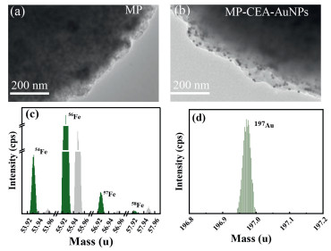 | Fig. 2. (a) TEM images of MPs. (b) TEM images of MPs-CEA-AuNPs. (c) The interference of 54Fe, 56Fe, 57Fe and 58Fe in the mass range of 53.91–53.97, 55.91–55.97, 56.91–56.97, 57.91–57.97, respectively. Green, signal peak; gray, interference peak. (d) The interference of 197Au in the mass range of 196.8–197.2. | |