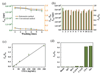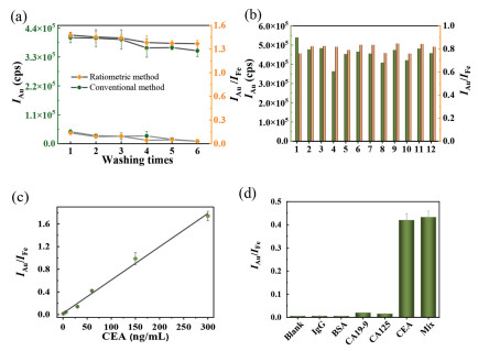 | Fig. 3. (a) The signal values of blanks and samples obtained by traditional immunoassay and the proposed ratiometric immunoassay at different washing times. (b) The corresponding IAu/IFe and IAu values of the 12 samples at the same CEA concentration. (c) Calibration curves between the IAu/IFe and CEA concentration. I represent the intensity value of ICPMS. (d) The IAu/IFe values of 100 ng/mL IgG, 100 ng/mL BSA, 100 U/mL CA19-9, 100 U/mL CA125, 100 ng/mL CEA and mixture. | |