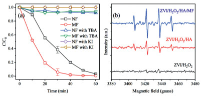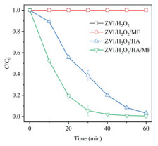 Since the Fenton reaction was usually thought responsible for •OH formation in the ZVI technologies, the evolution of aqueous iron was measured. Like the previous researches [6, 8, 9], the liberation of aqueous iron was promoted in the ZVI/H2O2/HA/MF system (Fig. S3). Obviously, the corrosion of iron particles was accelerated by the introduction of MF. The mechanism was usually proposed relating to the magnetic gradient around iron particles.