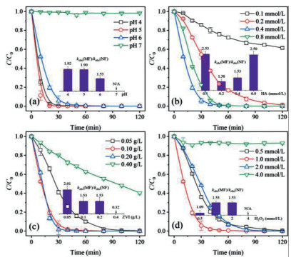 The enhancement by MF at different conditions is illustrated within the inset of Figs. 2a-d. Obviously, at most of investigated conditions, MF could accelerate the degradation of SMX. It indicated the introduction of MF was beneficial to the ZVI/H2O2/HA system.