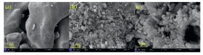 | Fig. 5. SEM images of (a) the pristine iron particles and the solid samples collected from the (b) ZVI/H2O2/HA and (c) ZVI/H2O2/HA/MF systems. | |