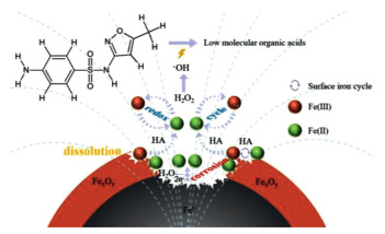 Based on the above discussion, it was expected that the coexistence of WMF and HA would bring cooperative reinforcement on ZVI based Fenton-like technology at near neutral pH (4.0 - 6.0). The rapid degradation of refractory organic pollutants might be possible with this compounding technology. However, the coupling effect of WMF and HA on ZVI was never reported. Therefore, the main objective of this study was to confirm the feasibility of applying ZVI/H2O2 system assisted by both HA and WMF to degrading SMX at near neutral pH. The conditional parameters, e.g., pH and the dosages of ZVI, HA and H2O2, were also investigated. After the qualification of responsible oxidant, evolution of iron species and characterization of solid samples, a homogeneous/heterogeneous mechanism was proposed.