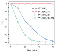 | Fig. 1. Degradation of SMX in the comparative systems. Initial conditions were: 0.1 g/L ZVI, 1.0 mmol/L H2O2, 0.4 mmol/L HA, 10 mg/L SMX, pH 6.0 and 25 ℃ | |