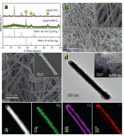 | Fig. 2. (a) XRD patterns of AgNW@CeOHCO3 and AgNW@CeVO4, SEM images of (b) AgNWs and (c) AgNW@CeVO4 samples, (d) TEM images of the AgNW@CeVO4, (e-h) STEM image and the corresponding EDS elemental mapping of the AgNW@CeVO4 pure phase and high crystallinity of the resulting CeVO4 hollow spheres. | |