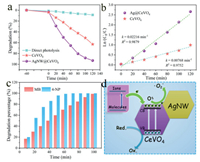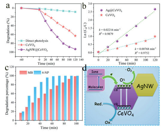 | Fig. 3. (a) Photocatalytic degradation of RhB under full spectrum light irradiation as a function of the irradiation time without catalyst, and over the as-prepared CeVO4 and AgNW@CeVO4 samples. (b) Corresponding plots of ln(C0/C) against irradiation time for the photocatalytic degradation of RhB under full spectrum light over different catalysts. (c) Photodegradation of MB and 4-NP under full spectrum light irradiation over the as-prepared AgNW@CeVO4 catalysts. (d) Schematic diagram of possible photocatalytic mechanism for AgNW@CeVO4 heterogeneous system. | |