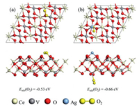 | Fig. 4. Optimized O2 adsorption structure on (a) CeVO4 and (b) Ag-CeVO4. | |