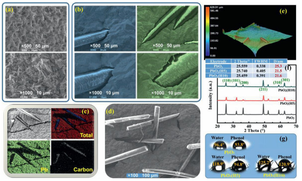 The hydrophobicity of the electrode was also changed by the hairs. The contact angles of water and phenol were 96.4° and 93.8°, respectively, on the unmodified PbO2 (Fig. 1g). On PbO2(H5), the angles rose to 118.9° and 94.8° correspondingly. The increasement of hairs would furtherly increase these contact angles (on PbO2(H10)).