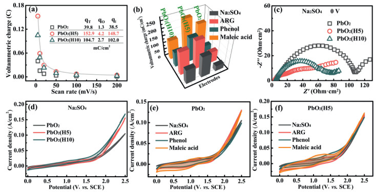 | Fig. 2. Electrochemical properties of the electrodes: (a) Voltammetric charge under different potential scan rate (potential range from 0 V to 0.3 V (vs. SCE)); (b) Voltammetric charge under scan rate of 5 mV/s in 0.5 mol/L Na2SO4 solution containing 2000 ppm of different target pollutant (potential range from 0 V to 0.3 V (vs. SCE)); (c) Nyquist plot in in 0.5 mol/L Na2SO4 solution (equilibrium potential: 0 V (vs. SCE)); (d) Cyclic voltammograms of three electrodes in 0.5 mol/L Na2SO4 solution (scan rate: 10 mV/s); Cyclic voltammograms of unmodified PbO2 (e) and PbO2(H5) (f) in 0.5 mol/L Na2SO4 solution containing 2000 ppm of different target pollutants (scan rate: 10 mV/s). | |
