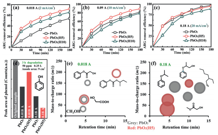 | Fig. 3. Electrochemical degradation results: ARG removal efficiency versus time under 0.018 A (a), 0.09 A (b) and 0.18 A (c); (d) Phenol residue after 3 h degradation under 0.018 A and 0.18 A. (e) Mass-to-charge ratio vs. retention time about phenol degradation intermediates after 3 h degradation under 0.018 A (gray circle: PbO2; red circle: PbO2(H5); circle diameter is proportional to the GC peak area). (f) Mass-to-charge ratio vs. retention time about phenol degradation intermediates after 3 h degradation under 0.18 A (All settings of circles are the same as above.). | |