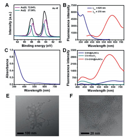 | Fig. 1. (A) XPS analysis of Au element in the CS-GSH@AuNCs. Fluorescent excitation and emission spectra (B) and UV-visible absorption spectra (C) of CSGSH@AuNCs. (D) Fluorescence spectra of GSH@AuNCs, CS-GSH@AuNCs, and the mixture of HAuCl4 and CS. TEM images of CS-GSH@AuNCs at low resolution (E) and high resolution (F). | |