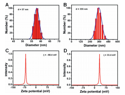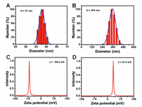 | Fig. 2. Hydrodynamic diameter of GSH@AuNCs (A) and CS-GSH@AuNCs (B). Zeta potential measurements of GSH@AuNCs (C) and CS-GSH@AuNCs (D). | |