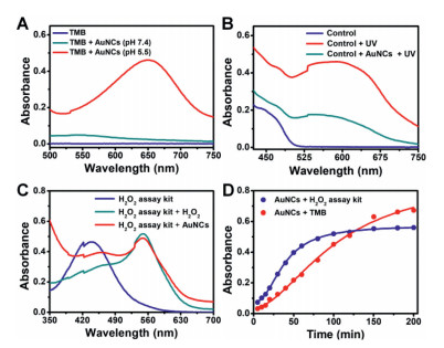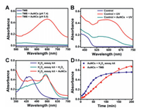 | Fig. 3. (A) UV-visible absorption spectra of TMB without and with CS-GSH@AuNCs. (B) SOD-like activity measurement by NBT chromogenic method, the control refers to the mixture solution of riboflavin (200 μmol/L), methionine (130 mmol/L) and NBT (750 μmol/L). (C) H2O2-generation determination via commercial H2O2 analyzer. (D) The changes of the production of H2O2 and ·OH with time. | |