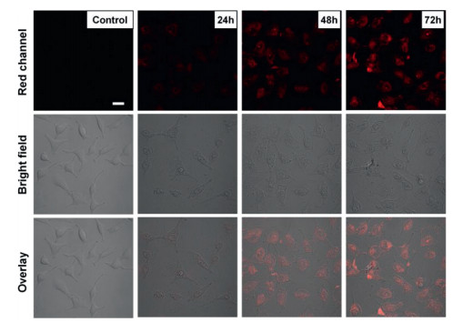 | Fig. 4. Fluorescence confocal microscopy images of Hela cells alone (the line of control), and cells treated with CS-HAuCl4 incubated for 24-72 h (The scale bar is 20 μm). | |