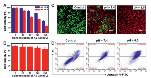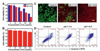| Fig. 7. (A) Cell viability of HeLa cells treated with CS-HAuCl4 for 48 h under different pH. (B) Cell viability of 293-T cells after incubation with CS-HAuCl4 for 48 h at pH 7.4. (C) Fluorescence confocal images of HeLa cells costained with calcein AM (green, live cells) and PI (red, dead cells) after incubation without (control) or with CS-HAuCl4 for 48 h (the concentration of Au was 250 μmol/L, the scale bar is 100 μm). (D) Flow cytometry analysis of HeLa cell apoptosis after treatment without (control) or with CS-HAuCl4 for 48 h. | |