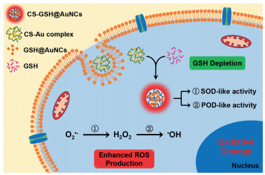 In this study, utilizing biocompatible chitosan (CS) as a stabilizer [38], in situ synthesis of red fluorescent CS-GSH@AuNCs was realized in cancer cells by consumption of endogenous GSH. More importantly, the synthesized CS-GSH@AuNCs exhibited both SOD and POD-like activity, which can catalyze O2·− to H2O2, and further to ·OH, and could be used to enhance CDT by depleting GSH and in turn facilitating H2O2/·OH production (Scheme 1). The CS-GSH@AuNCs showed high cytotoxicity toward HeLa cells but little harm to normal cells. The anticancer CDT efficacy of the synthesized CS-GSH@AuNCs was proven in vitro by MTT assay, calcein AM/PI costaining assay and flow cytometric analysis, and the results demonstrated that the CS-GSH@AuNCs had good cancer cell killing effects.