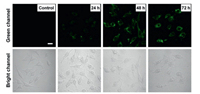 | Fig. 6. Fluorescence confocal microscopy images of HeLa cells only stained with DCFH-DA (the line of control), and cells incubated with CS-HAuCl4 for 24-72 h before staining with DCFH-DA (the scale bar is 20 μm). | |