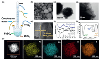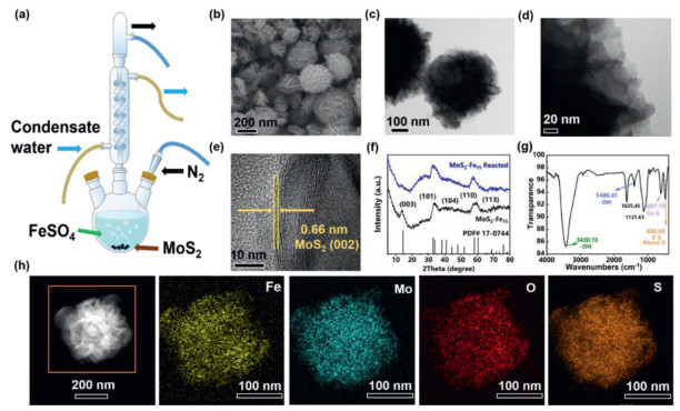 | Fig. 1. Characterization of MoS2-Fe75. (a) The experimental device for preparing MoS2-Fe75. (b) SEM image of MoS2-Fe75. (c, d) TEM images of MoS2-Fe75. (e) HRTEM image of MoS2-Fe75. (f) XRD patterns of MoS2-Fe75 before and after reaction. (g) Infrared spectrum of MoS2-Fe75. (h) EDX mapping images of MoS2-Fe75. | |