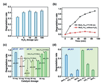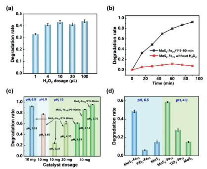 | Fig. 2. Degradation rate of SD under different conditions with MoS2-Fe75. (a) Degradation rate at different dosages of H2O2 without adjusting pH (H2O2 is added at one time; SD: 10.0 mg/L, MoS2-Fe75: 100.0 mg/L, Reaction time: 30 min). (b) Changes in degradation rate over time under optimal conditions (SD: 10.0 mg/L, MoS2-Fe75: 100.0 mg/L, MoS2-Fe75/1*9-90min, pHi 6.50). (c) The degradation of different dosages of catalyst and H2O2 under different pH (pHe means the pH value at the end of reaction). (d) The degradation efficiency of other catalysts prepared by the same method (SD: 10.0 mg/L, catalyst: 100.0 mg/L, MoS2-Fe75/1*3-30min). | |