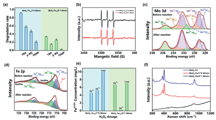 | Fig. 3. Detection of ROSs in the system and changes in catalysts before and after the reaction. (a) Degradation rate of SD in the presence of different radical scavengers including TBA (0.02 mol/L), p-BQ (0.70 mmol/L), and TEMP (0.14 mmol/L) for the quenching of ·OH, ·O2–, and 1O2, respectively, under the optimal conditions (SD: 10.0 mg/L, MoS2-Fe75: 100.0 mg/L, MoS2-Fe75/1*9-90min). (b) EPR spectra for the detection of 1O2 in the presence of TEMP (98.0%, GC), using water as the solvent. The details of the EPR tests are as follows: capture agent was added into the reaction solution after the reaction started for 1 min, and the EPR test was performed after mixing the two solutions for 30 s. (c) The XPS pattern of Mo 3d before and after co-catalytic Fenton reaction (left to right: 235.5, 232.9, 232.2, 231.4, 231.0, 229.7, 229.1, 228.3 eV). (d) The XPS pattern of Fe 2p before and after co-catalytic Fenton reaction (left to right: 732.5, 726.7, 723.8, 718.8, 713.3, 710.6, 708.7 eV). (e) The concentration of the dissolved iron ions in the system of MoS2-Fe75/1*9-90min and MoS2-Fe75/1*9-90min (pHi 6.5). (f) Raman spectra of MoS2-Fe75 and MoS2-Fe75 after different H2O2 added in the way of MoS2-Fe75/1*9-90min and MoS2-Fe75/1*9-90min. | |