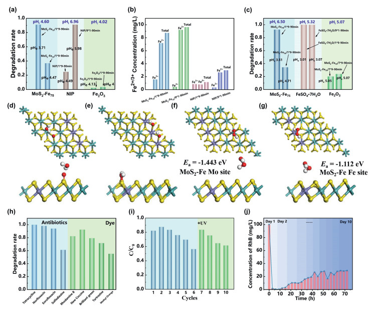 | Fig. 4. Comparative experiments of different Fenton systems (SD: 10.0 mg/L, catalyst: 100.0 mg/L, reaction time: 90 min) and the adsorption energy of H2O2 to the surface of catalyst at different distances and degradation universality and stability test: (a) pH after adding the catalyst and its degradation effect with different H2O2 adding ways. (b) Concentration of iron ions in the solution after the reaction (pHi 4.0). (c) Comparison of homogeneous and heterogeneous Fenton systems. (d, e) The reaction of H2O2 on Mo and Fe sites of MoS2-Fe75 when H2O2 is close to the surface. (f, g) The adsorption energy of H2O2 on Mo and Fe sites of MoS2-Fe75 when H2O2 is far from the surface. (h) Degradation test for different pollutants with 100.0 mg/L MoS2-Fe75 under optimal degradation condition (Pollutant: 20.0 mg/L, MoS2-Fe75/1*9-90min for antibiotics and MoS2-Fe75/1*3-30min for dyes). (i) Cycle tests of the degradation of RhB (20.0 mg/L) in the MoS2-Fe75 + H2O2 system under the optimal conditions (MoS2-Fe75: 100.0 mg/L, MoS2-Fe75/1*3-30min). (j) 10-day continuous degradation of RhB (total concentration: 2500.0 mg/L). | |