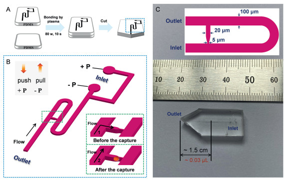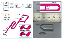 | Fig. 1. Preparation process and specific fluid channel details of the modular single-cell pipette (mSCP). (A) Schematic diagram of the mSCP chip preparation process, including lithography, casting, sealing and cutting. (B) The diagram of the mSCP chip channel structure, illustrating a linked-channel (capture unit) for the capture of single-cell. (C) The real picture and main structure dimensions of the mSCP chip. | |