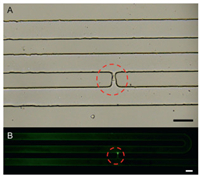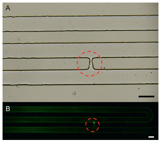 | Fig. 3. The illustration for capturing individual cells on the mSCP. (A) Microscopic image of the captured cell on the mSCP at the cell number density of 1 × 106 cells/mL. (B) Fluorescence microscopic image of the captured cell after AO staining (4 ℃ for 20 min in the dark). The capture unit structure has less damage to the captured cells. Scale bar, 100 μm. | |
