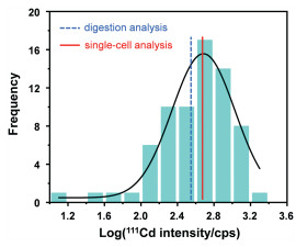 | Fig. 4. Histogram showing the log-normal distribution of Cd mass for the detection of 70 individual cells. The two averages from single-cell probabilistic analysis (the red solid line) and cell digestion analysis (the blue dot line) are 482 fg and 353 fg, respectively. | |