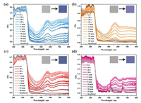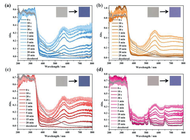 | Fig. 2. Time-dependent UV-vis spectra of the original, irradiated and decolored samples (a) 1, (b) 2, (c) 3 and (d) 4. Insert: the photos of the coloration process upon irradiation. | |
