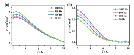 | Fig. 3. Plots of χ' (a) and χ'' (b) versus T for compound 1 in a 2000 Oe dc field. | |
