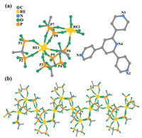 | Fig. 1. (a) Asymmetric unit of the isostructural compounds. (b) The REdiphosphonate chain. Atom legend: P, light orange; N, blue; O, sea green; C, gray-40%; RE, gold. H atoms and water molecules are omitted for clarity. | |