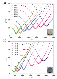 | Fig. 4. Time Nyquist plots of impedance spectra of 1 (a) and 1a (b) at 100% RH and different temperatures ranging from 303 K to 353 K. | |